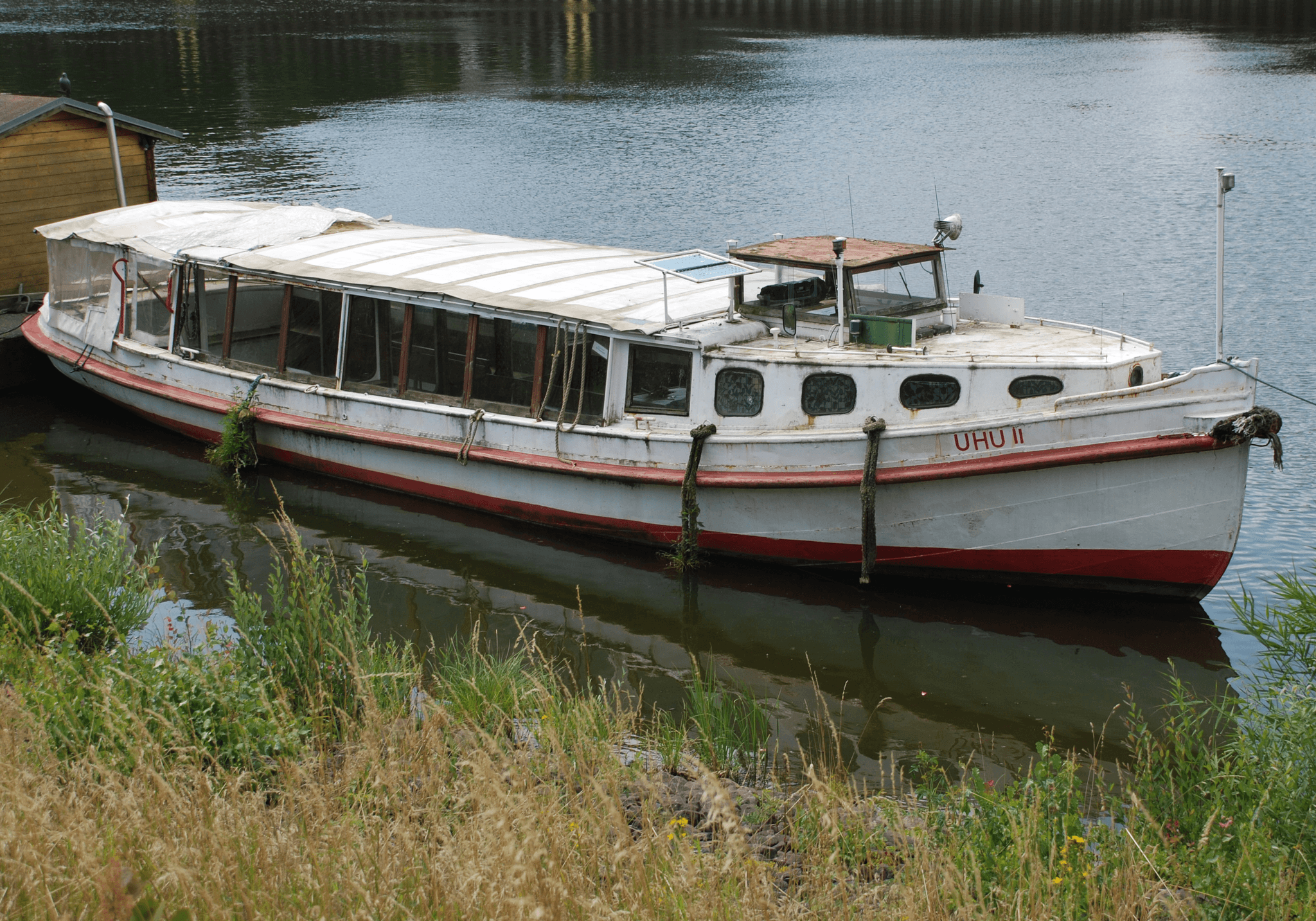 Our ship was built in 1923 at the Schüler-Werft near the Moorreger Dike at the Pinnau-Canal, not far from the town of Uetersen, Hamburg, as a ‘Hamburger Hafenbarkasse’ called ‘ Heinrich Lippmann’, powered by a steam engine. This was replaced by a diesel engine in 1940 and in 1949 the ship was baptized ‘Carmen’. Later it became the ‘Nordsee VII’. In 1960 the hull was made wider and longer, and finally in 1994 the vessel was baptized ’UHU II’. This is how we found the UHU II in 2021. It was run by the shipping company ‘Reederei Helle’ in Lauenburg as a touring boat, to explore the Scharnebeck twin ship lift, a 38-metre (125 ft) boat lift in Scharnebeck, northeast of Lüneburg.